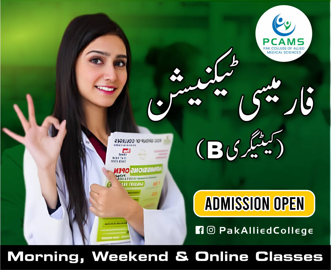 Pak College of Allied Medical Sciences (PCAMS) is a registered institute and holds affiliation with the Punjab Pharmacy Council. We proudly offer a comprehensive 2-year course, recognized as an equivalent qualification to FSC. With a single fee payment, enrolled students will have the opportunity to earn a Pharmacy Technician (B Category) that is also recognized as a FSC degree.